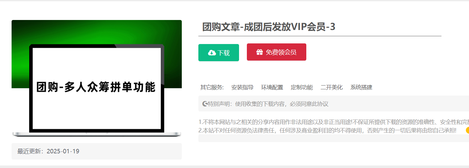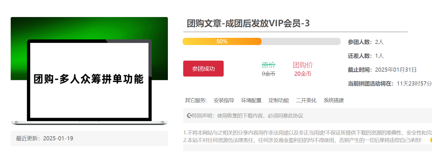 3.拼团成功:当参团人数足够了,则代表拼团成功,已参团的用户即可【直接下载资源/获得VIP会员】根据当前拼团介绍为准