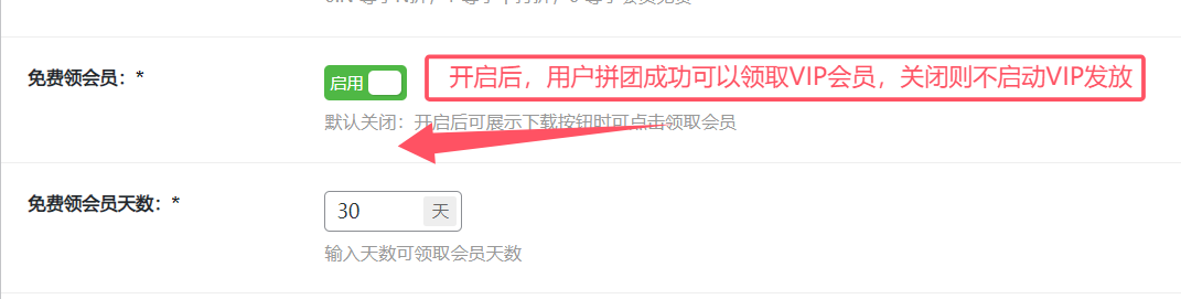2.如果你想让用户来拼单众筹VIP会员,就把成团后发放VIP会员的开关打开,设置VIP天数即可,成团后用户可直接领取