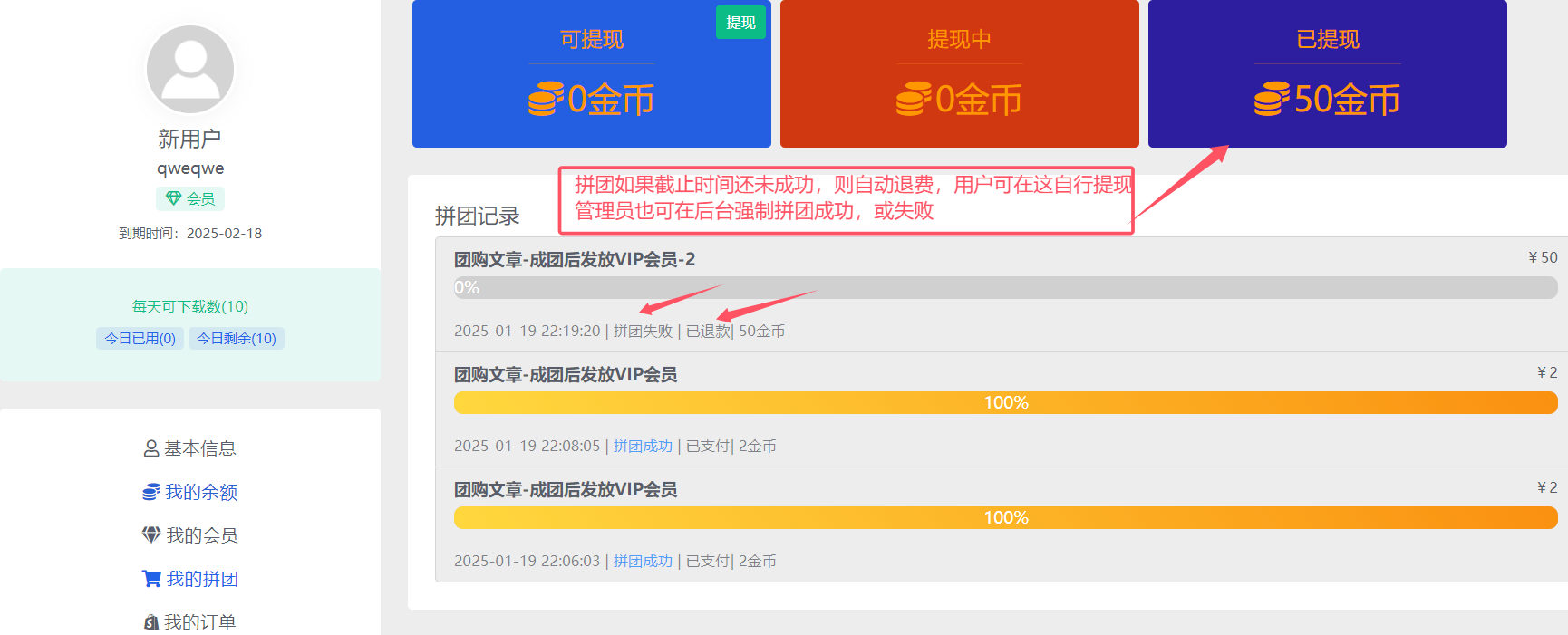 2.拼团失败:付款后,如果倒计时结束,人数还没凑够,则拼团失败,费用会自动退回,可提现【如果享受了参团赠送福利商品,代表放弃提现权益,但退回金币可用于站内消费或升级VIP使用,已赠送的VIP,优惠奖励可正常使用,不回收】