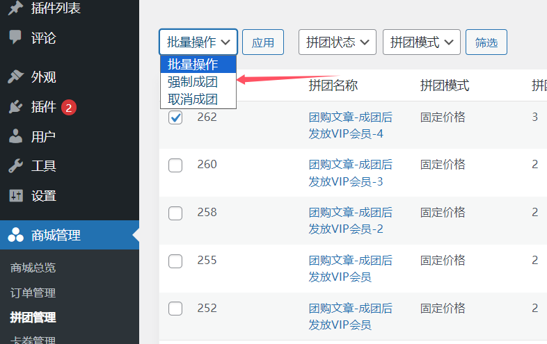 2.管理员可以强制变更拼团资源状态,强制拼团失败或者成功,若强制失败,参团用户费用会自动退回到网站账户中