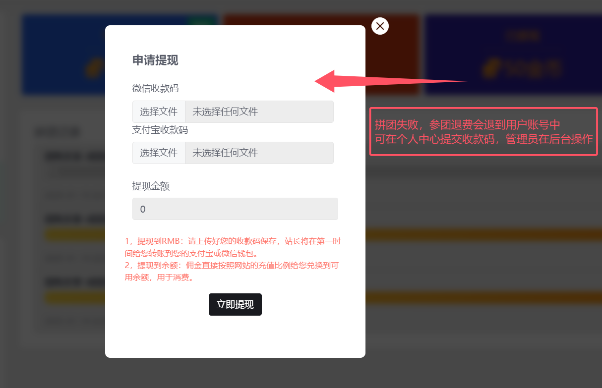 4.拼团退费:是独立的存储系统,不是推广佣金。用户可在个人中心上传收款码进行提现