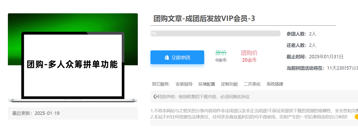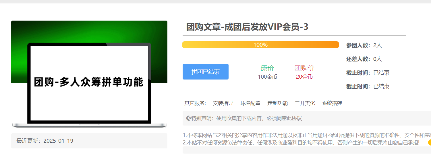 1.需要众筹下载资源,正常设置团购参数即可,成团后,参团用户自动解锁下载权限,未参团用户则会提示拼团已结束