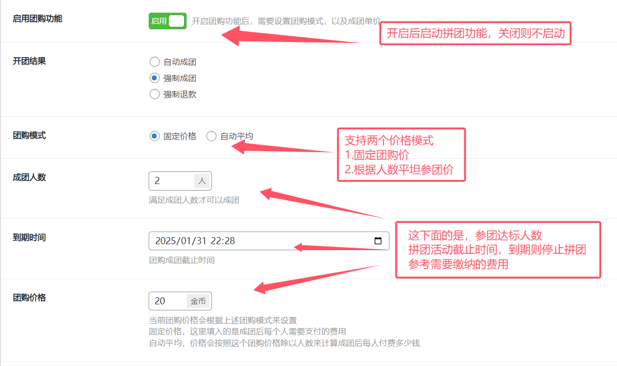 1.团购通过文章开关控制,开启后设置相关(参团人数,团购价格,拼团截止日期)