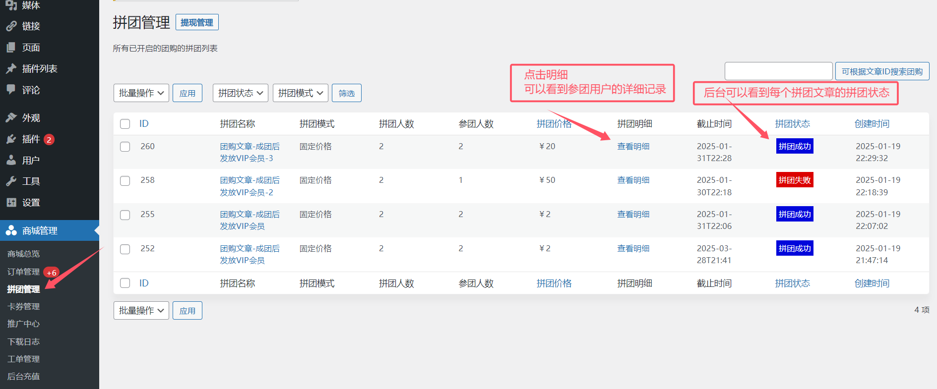 1.管理员在后台可以看到拼团文章状态,有哪些,正在拼团,或失败了,或成功了