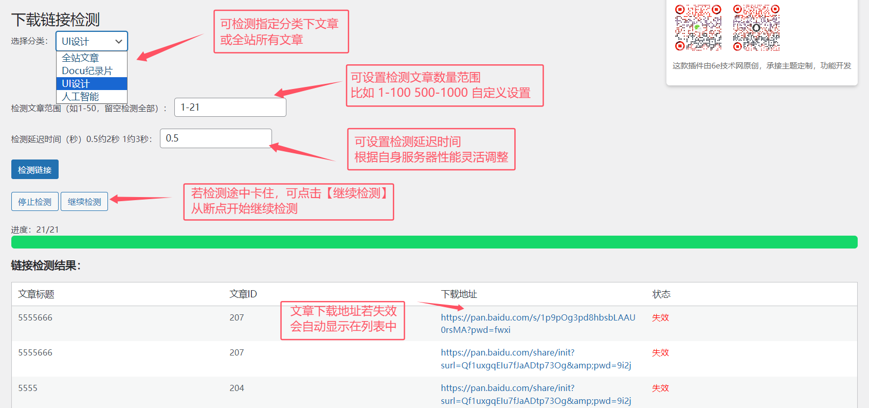 这款插件,可以自动检测文章的,失效下载地址,方便自己补新的下载地址,节省时间。如果你网站需要检测的文章数量很多,推荐入手这款升级版