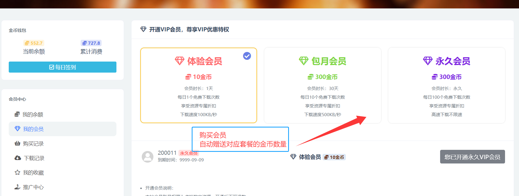 购买VIP就送金币,可以用来做活动宣传,这样能够提高网站转化。