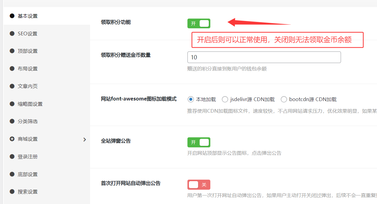 图1.后台开关控制与设置赠送的金币数(截图展示)