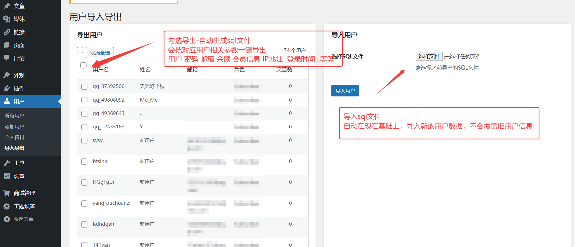 如果你需要把一个站的用户信息,导入到另外一个站,那么就可以用到这款插件,用这个导入不会覆盖原有的用户数据,非常方便,导出的用户信息还会保留相关的用户信息,余额..会员等级这些