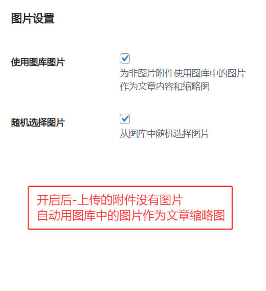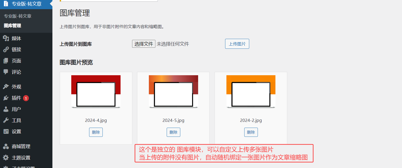 5.图库功能 :可以上传多个自定义图片。当上传的附件,没有图片的时候,会自动随机提取一张图片作为文章缩略图,提高美观