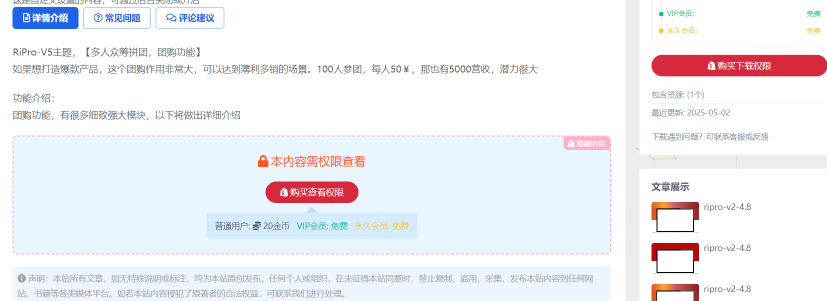 5.权益介绍:通过参团购买的商品/VIP会员,可享受正常售后服务【VIP下载权限/长期更新/主题更新/BUG修复/安装服务/客服解答】