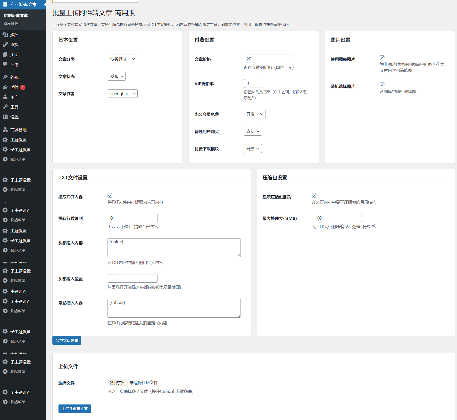 这款插件,在后台上传附件(txt文本,图片,压缩包,或其它附件)就可以自动转成文章,还可以自己设置文章付费参数,价格..会员权限..等等,可以批量上传,非常方便