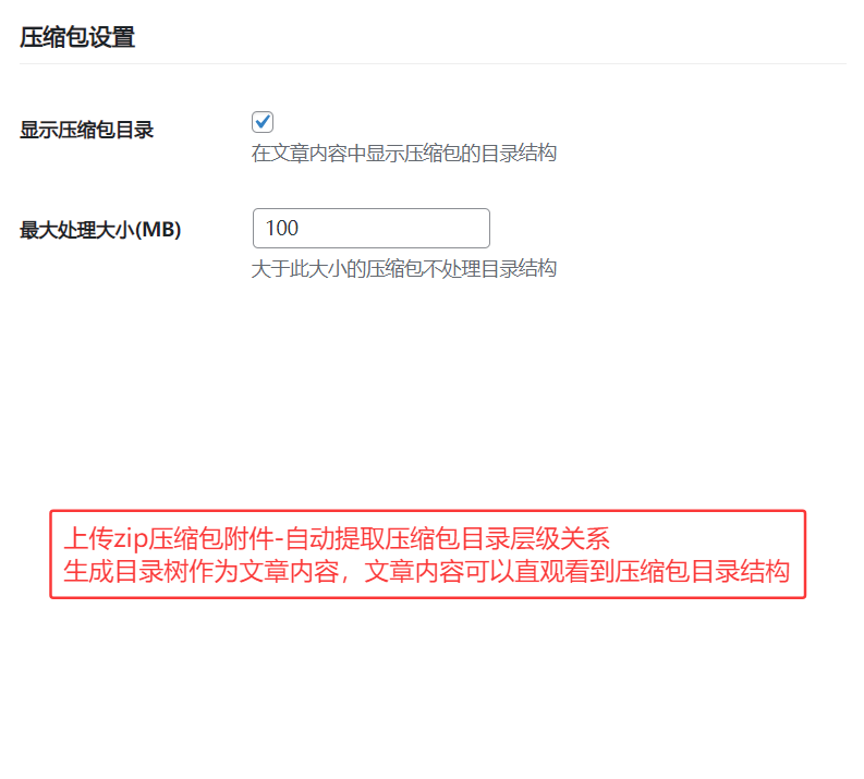 3.上传zip压缩包:只自动提取压缩包中的文件夹和文件名称,生成目录树作为文章内容,在文章中可以看到压缩包的层级关系