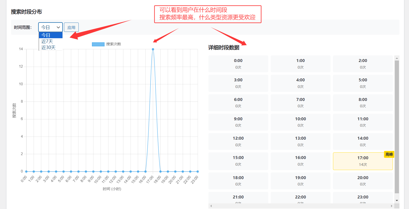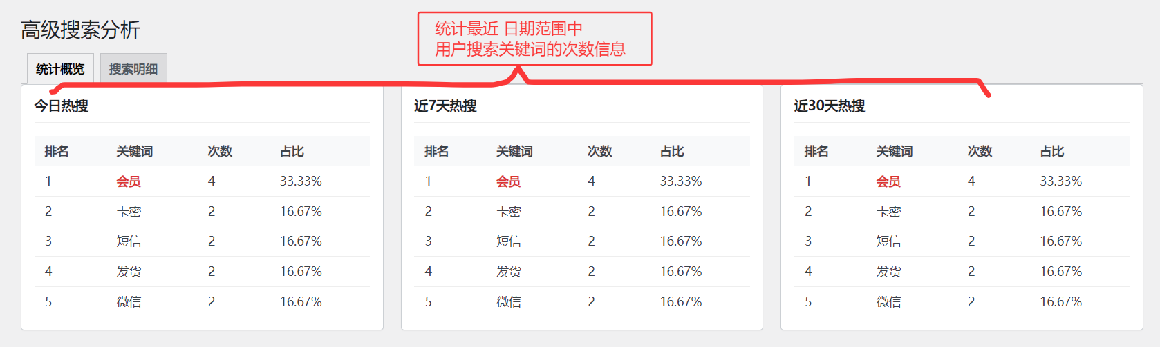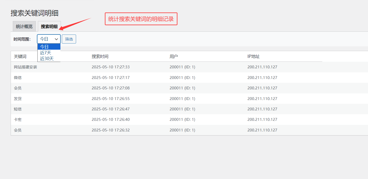 2.统计模块-1:可以在后台看到 今日 近7天 近30天 用户的搜索关键词记录,可参考图1.