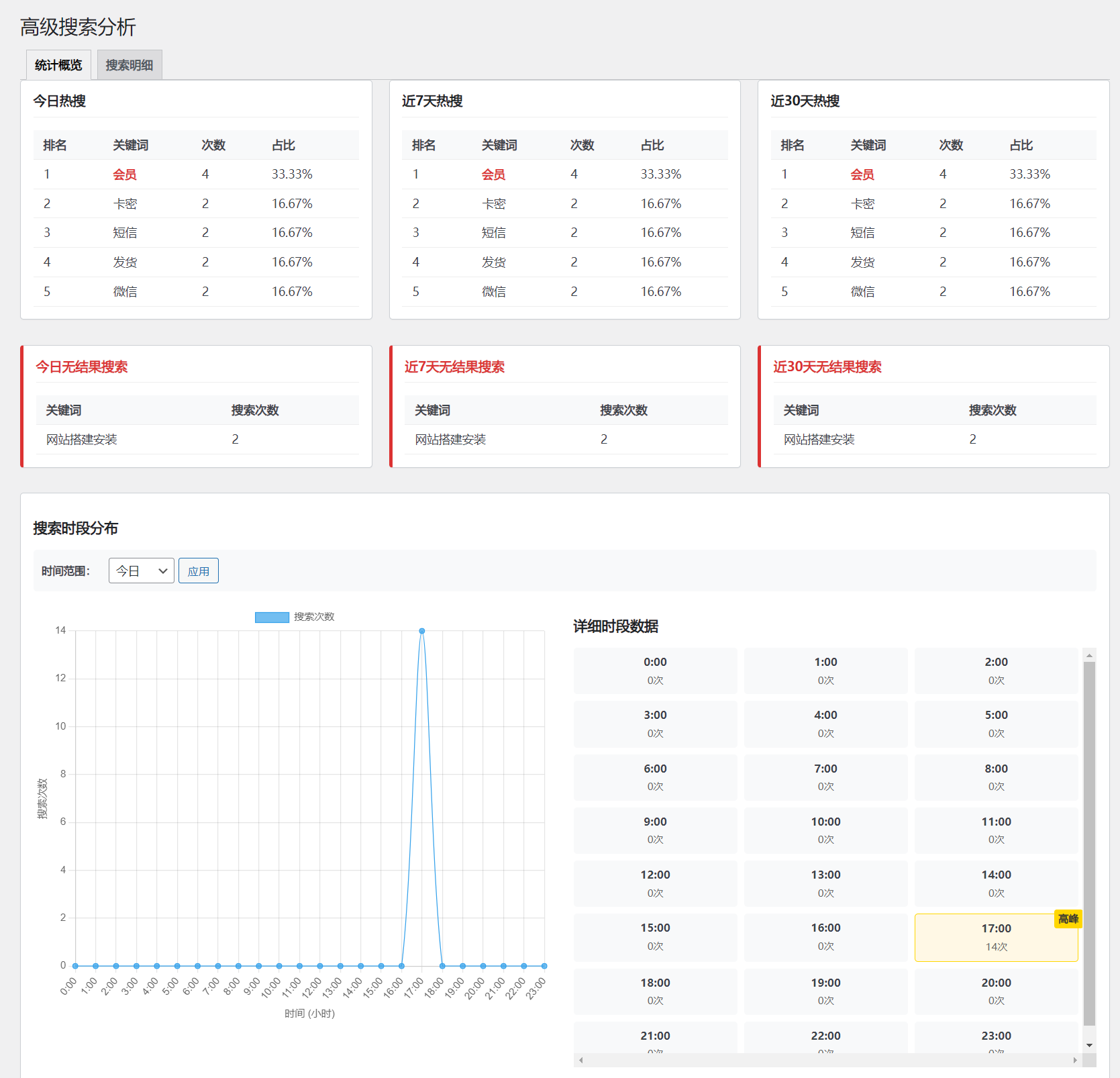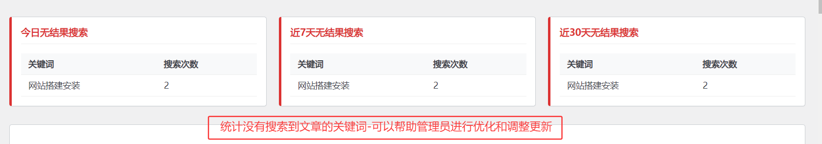 2.统计模块-2:可以统计用户搜索的哪些关键词,没有搜索到文章,会显示在模块中,方便管理员进行调整更新文章,可参考图1.