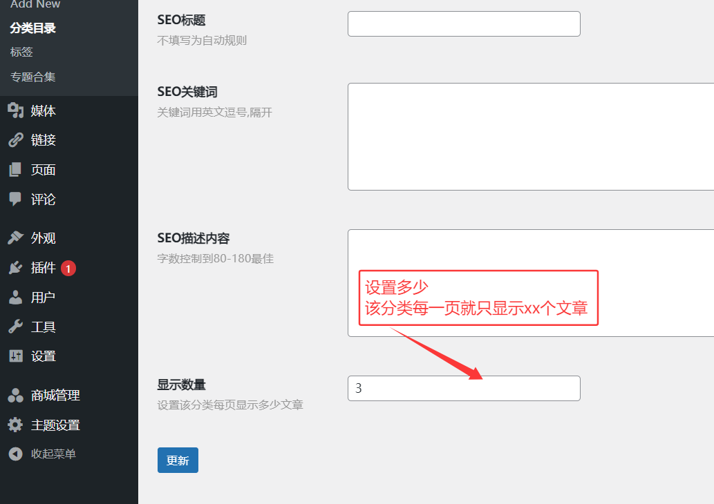 1.后台 分类 编辑分类页面,设置每一页显示xx文章数量,可参考图1.