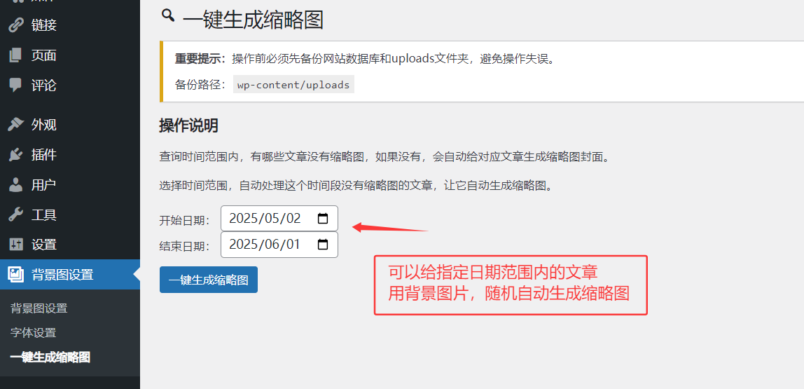 5.支持给指定日期时间内的文章,批量生成缩略图封面,比如(比如5月份到6月份,这中间的文章自动生成缩略图 )可参考图4.