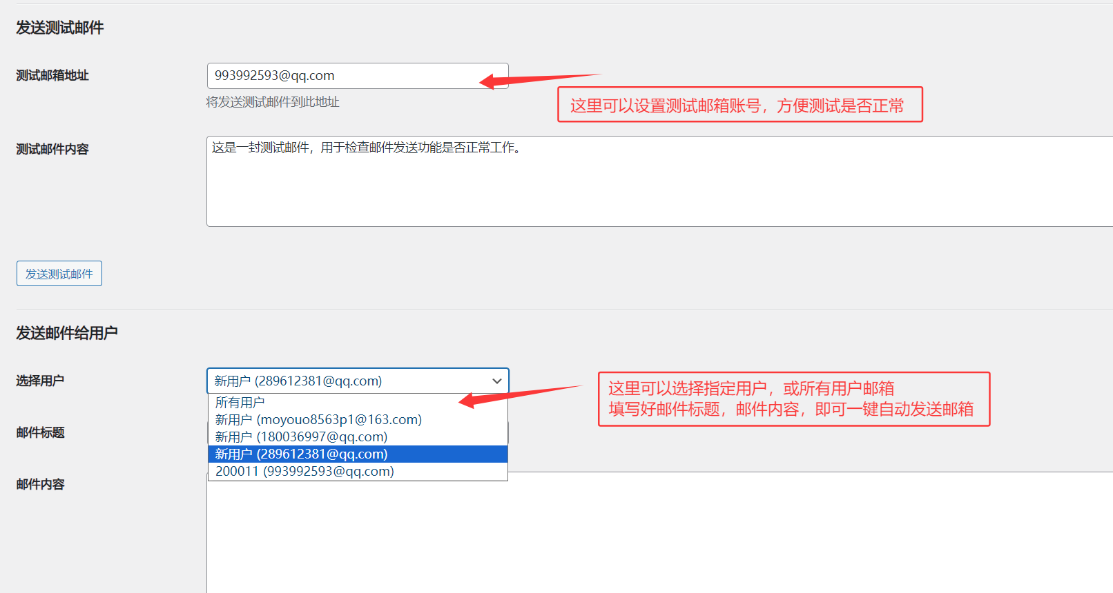 可以自定义邮件内容,标题,发送到网站用户邮件里,一键自动发送,也可以单独输入邮箱账户进行发送,非常方便,支持V2+V5(其它WP主题可自行测试,理论也可以使用)