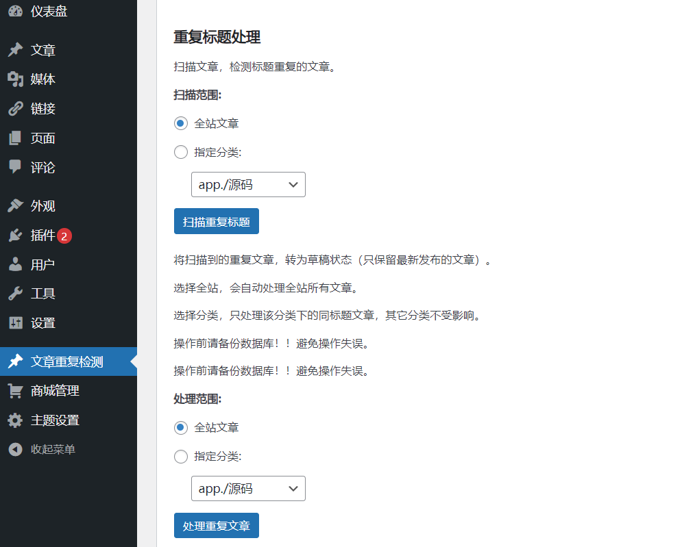 2.扫描全站:扫描所有文章,如果标题是重复的,就自动保留最新文章,其它的重复文章自动切换为草稿文章