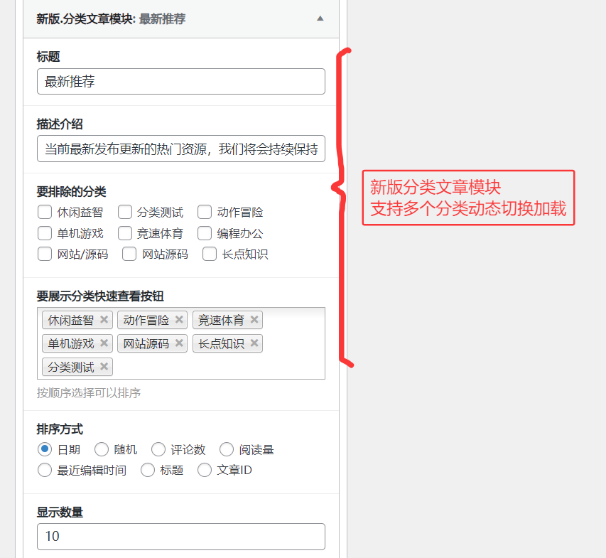 1.新版-分类文章小工具模块,支持切换分类动态加载,小工具可以自定义设置文章数,排除显示的分类,可参考图2.