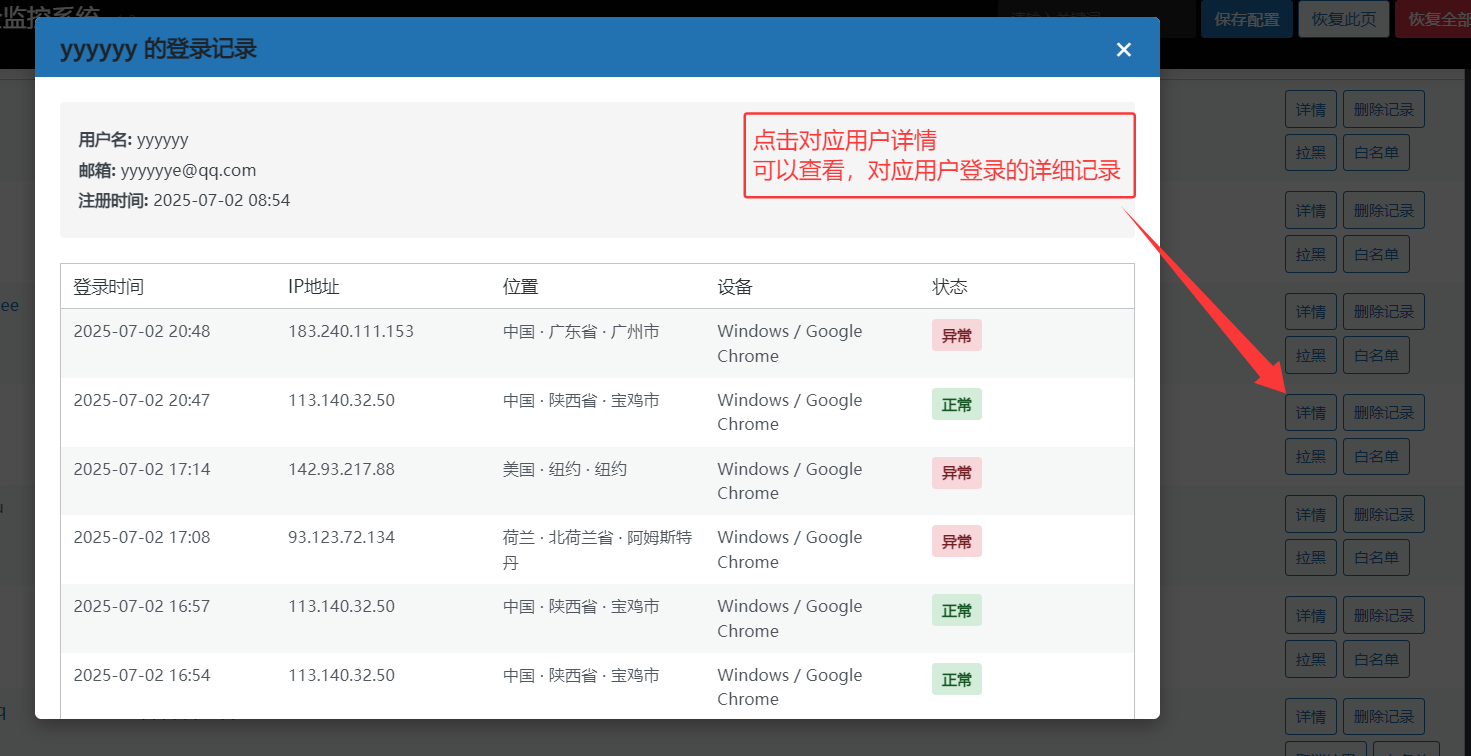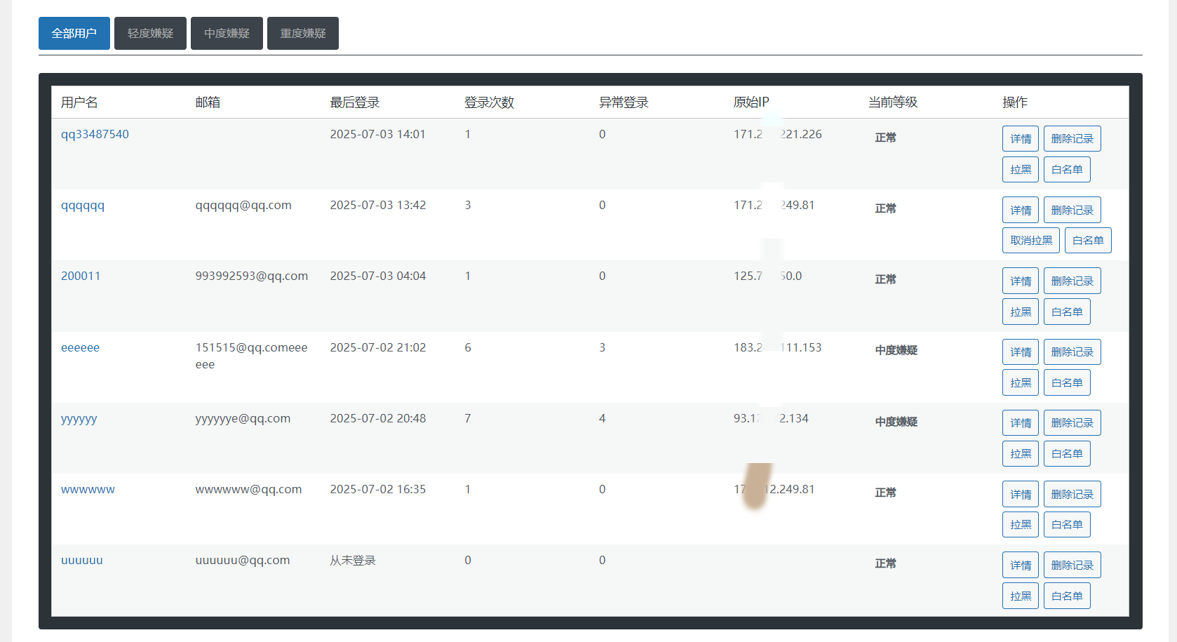 3.在异常记录这里,可以快速拉黑用户,加入白名单的操作,非常方便,内置有删除记录(点击后会清空相关用户的记录信息)