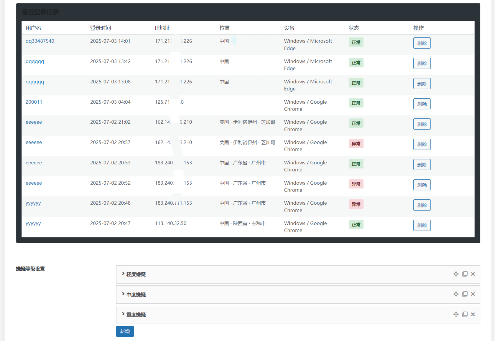 2.支持显示: 登录用户名、登录时间、登录IP地址、位置(国家-省份-城市)、登录设置、异常状态、记录删除