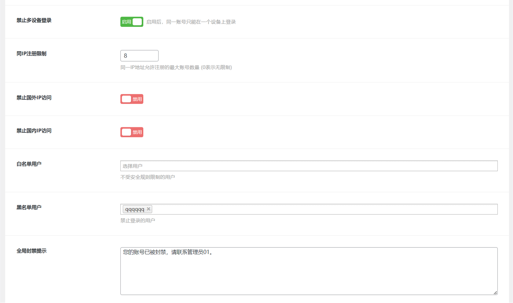 5.封禁账号后,用户登录的时候提示内容,可以在后台自定要设置