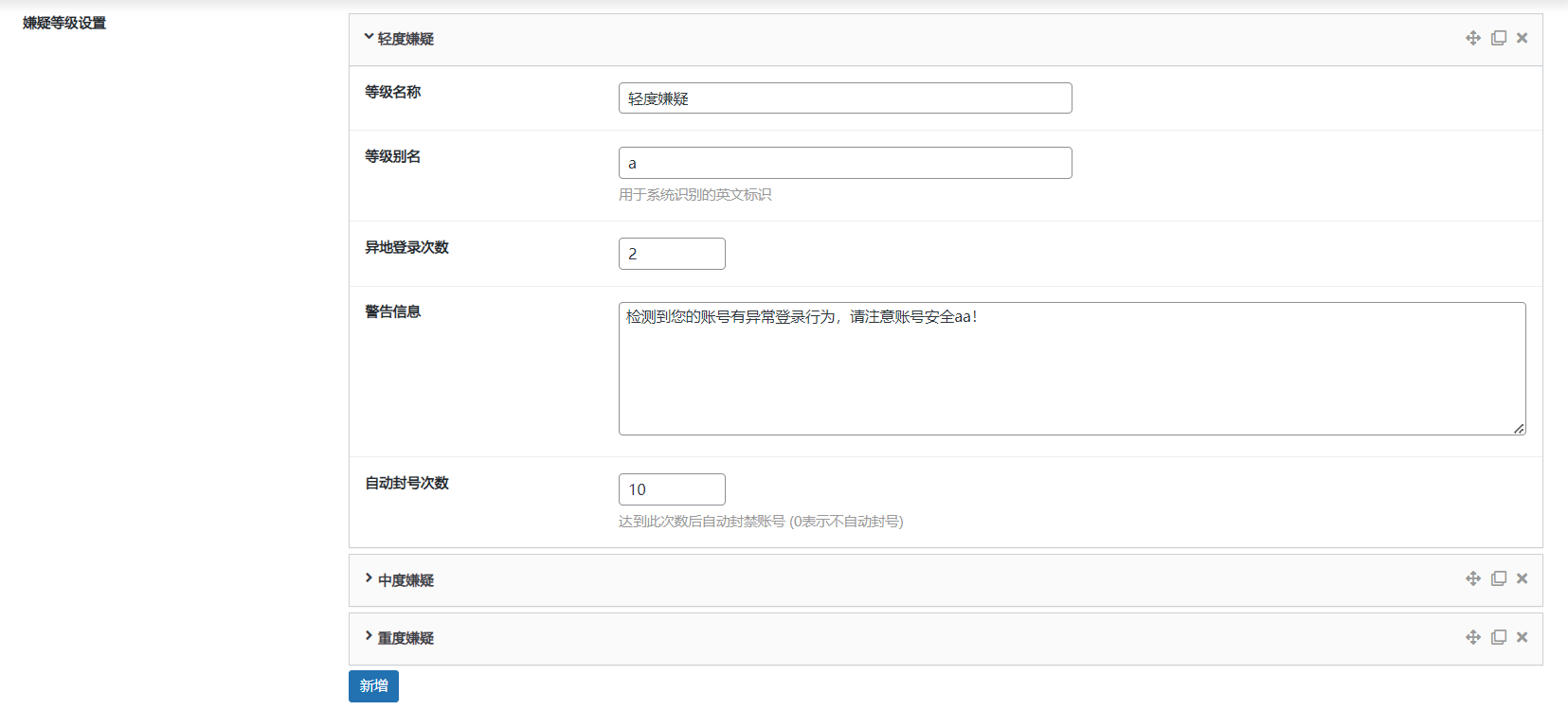 2.可设置,异常登录X数后,自动封禁账号,可以先弹窗预警告,超过设置的异常次数就自动封号